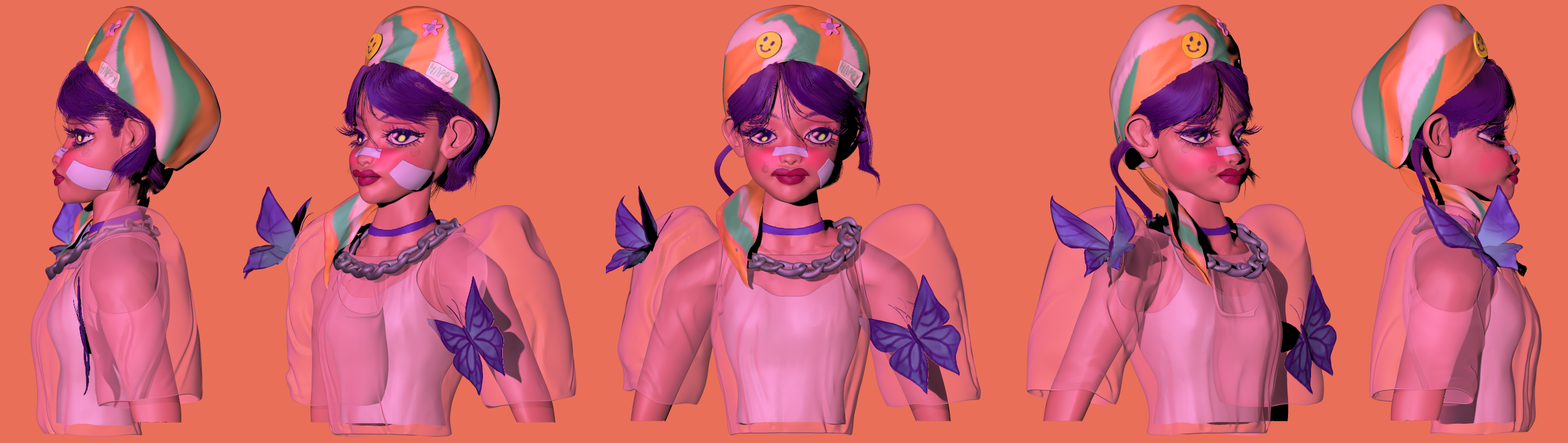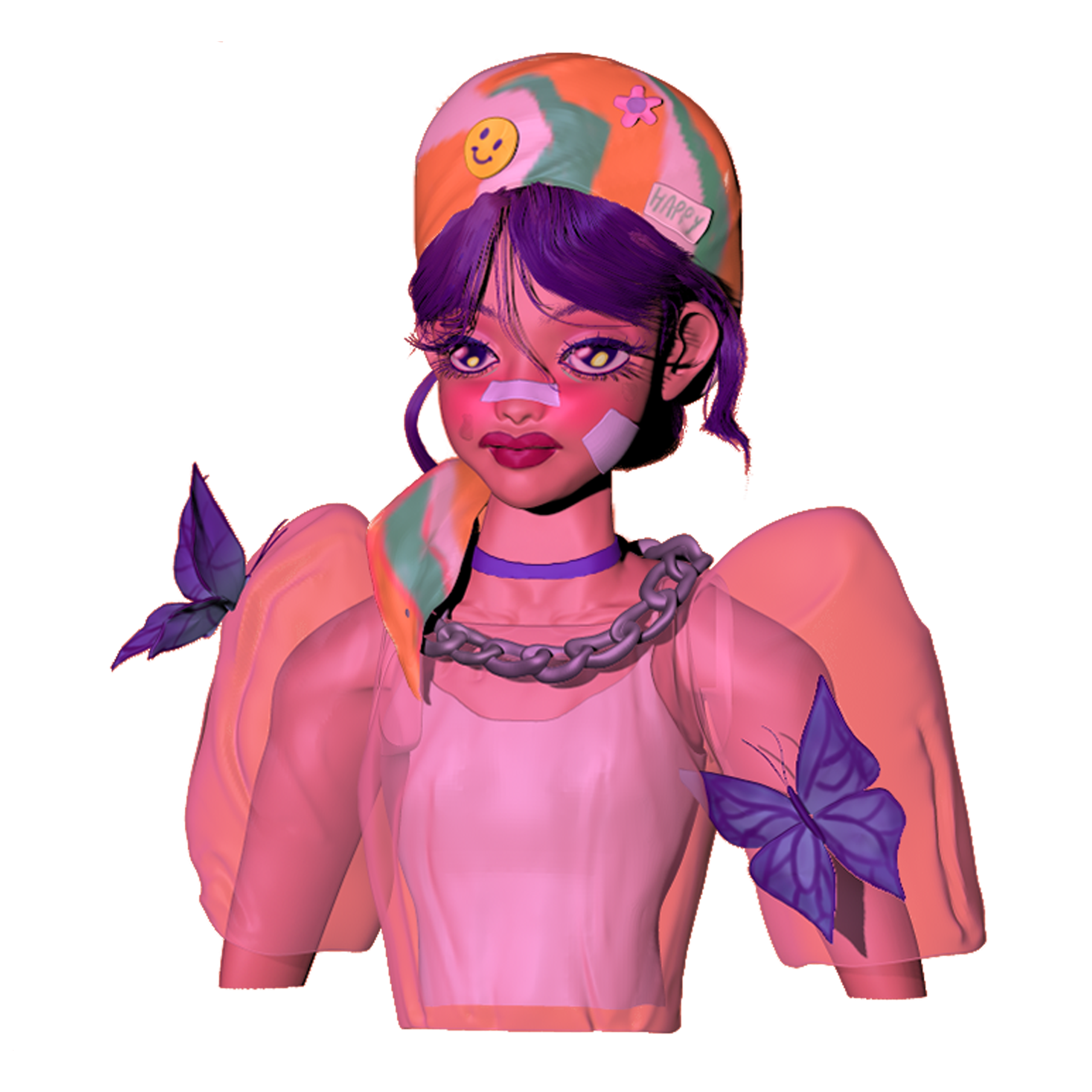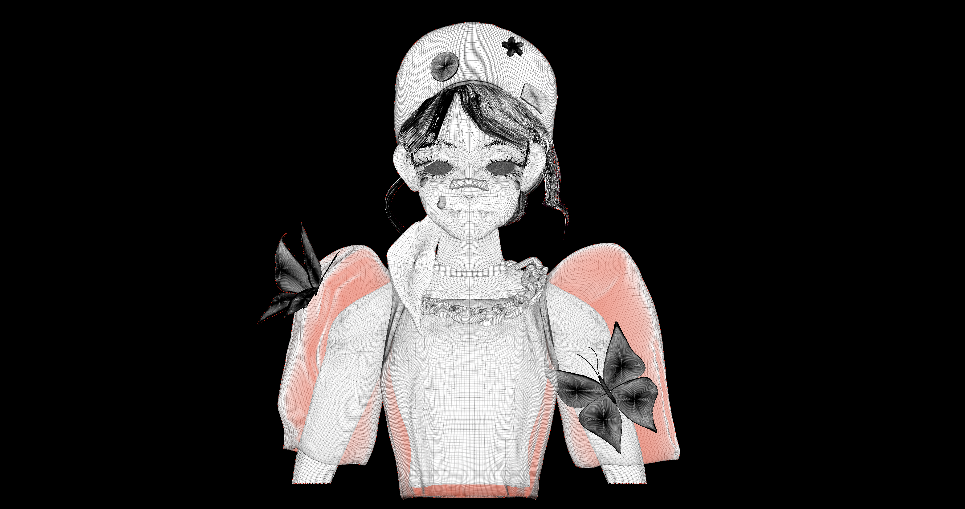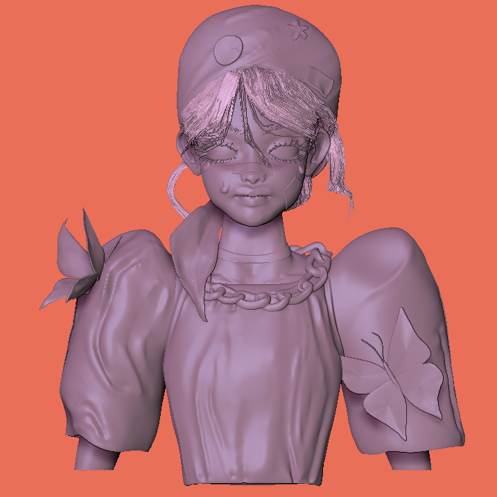 This 3D model is based on a concept art illustration by Coleen Real. I begun by creating a full-body blockout. Next, I sculpted the facial and bust details to refine the model’s details. Finally, I sculpted the clothes and butterflies on the model. I brought everything together by painting the model according to the colors on the original concept art.