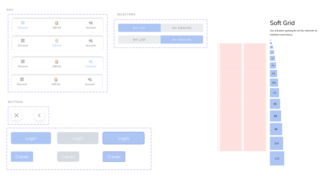 Our navigation bar varies based on the page you are on. The current page will be highlighted in blue to indicate what page the user is currently on. Our go back and exit buttons are simple, and white with a drop shadow to stand out on the page. Then we ahve our login/create buttons and our page selectors that vary in colors based on what toggle state a user is in. The blue indicates being on the selected page of button. We used a grid system for our design that would go up by 8s to keep consistency on all our pages in the app.