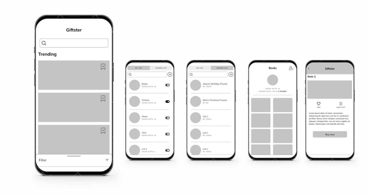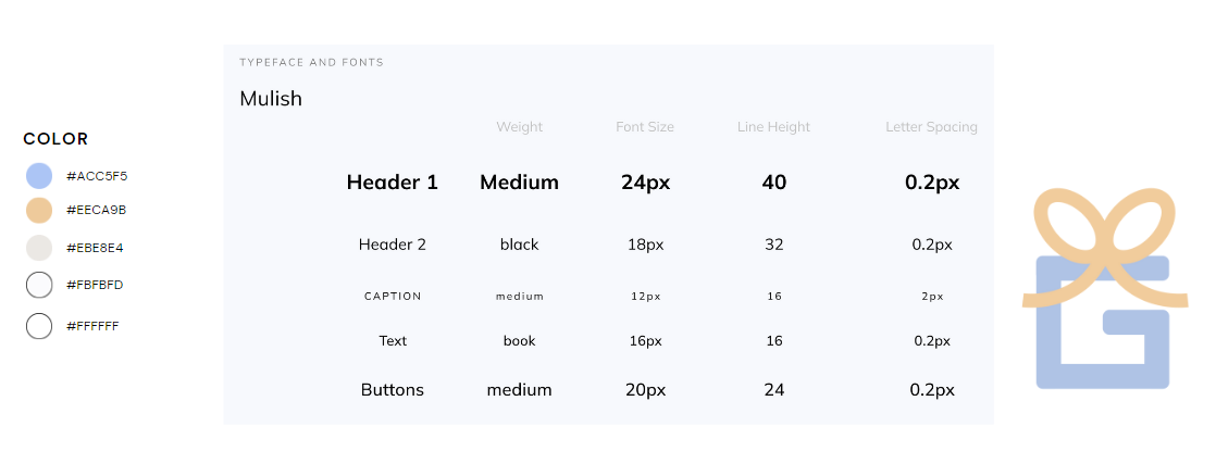 For our logo, we decided to use a simple illustration with a G for Giftster and a bow to show off a gift. We made it into a gif for the opening page. Our icons are commonly used icons that can be easily recognized by users. We want users to be able to use the icons as if they want to glance past the text.