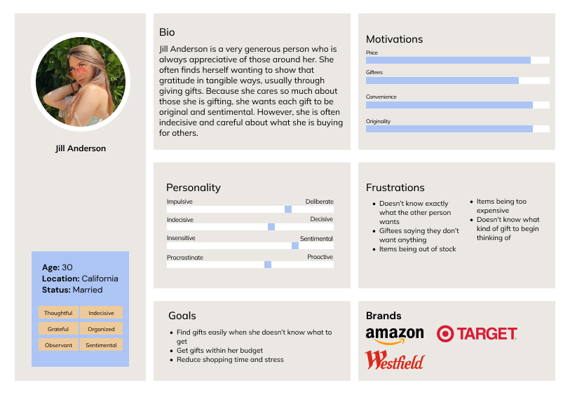 We created a questionaire that asked about the gift buying process, motives, and feelings throughout. Data and information collected from interviews formed our persona.