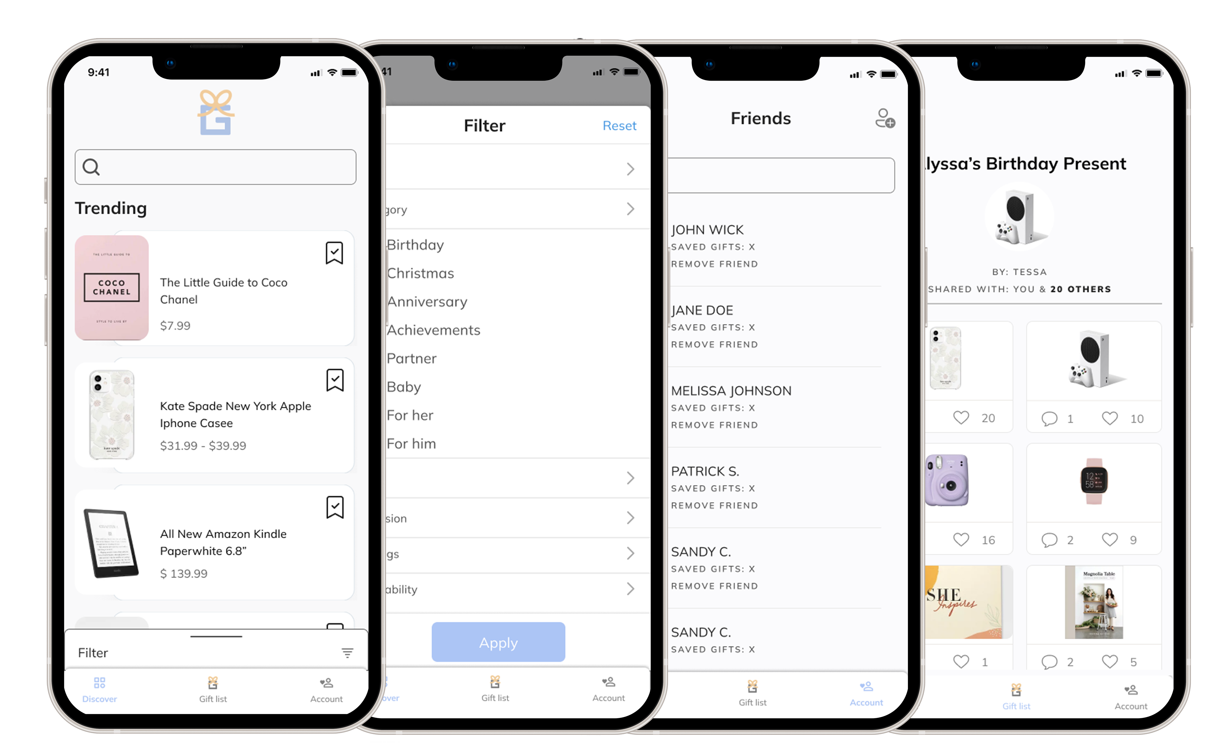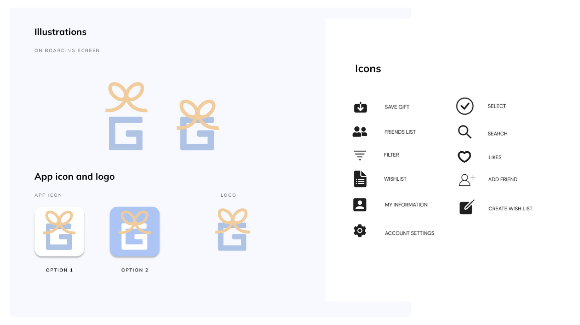 For our logo, we decided to use a simple illustration with a G for Giftster and a bow to show off a gift. We made it into a gif for the opening page. Our icons are commonly used icons that can be easily recognized by users. We want users to be able to use the icons as if they want to glance past the text.