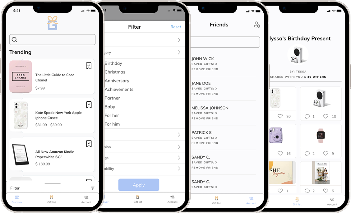 Help users find gifts faster by giving suggestions, sharing gift ideas, sharing wishlists.